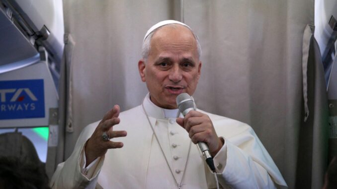 ROME, ITALY - DECEMBER 02: Head of Vatican State Pope Leo XIV makes statements to press members during his return flight from Beirut to Rome on a private plane provided to him by ITA Airlines in the evening, after completing his first official trip abroad, which included visits to Turkiye and Lebanon on December 02, 2025 in Rome, Italy. Baris Seckin / Anadolu (Photo by Baris Seckin / Anadolu via AFP)